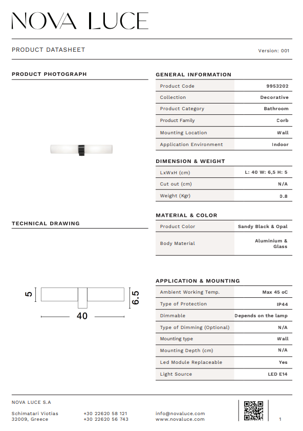NOVA LUCE CORB aplica - 9953202 - Sandy Black Aluminium & Opal Glass