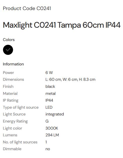 MAX LIGHT MAXLIGHT C0241 Aplice TAMPA 60CM 18W IP44 3000K