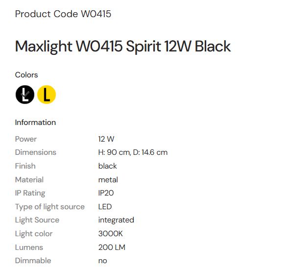 MAX LIGHT MAXLIGHT W0415 Aplice SPIRIT 12W, Negru