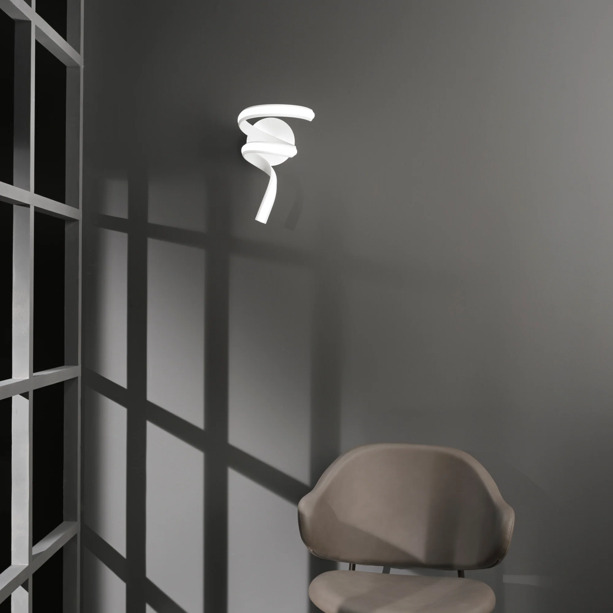Applique with sinuous shapes that represents a harmony of design and functionality, perfect for those looking for sophisticated and elegant lighting. Its structure in embossed white aluminum, with sinuous lines, not only adds a touch of refinement to the environment, but also reflects the light in a unique way, creating plays of shadows and lights that enrich the space.