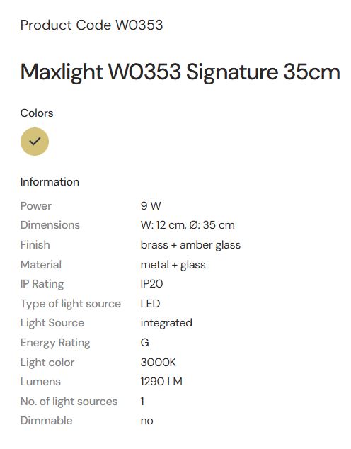 MAX LIGHT MAXLIGHT W0353 Aplice SIGNATURE 35CM AMBER