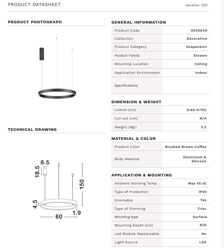 NOVA LUCE ELOWEN -Suspensie SP 60 Brushed Brown Coffee Aluminium & Silicone - Triac Dimmable light up & down