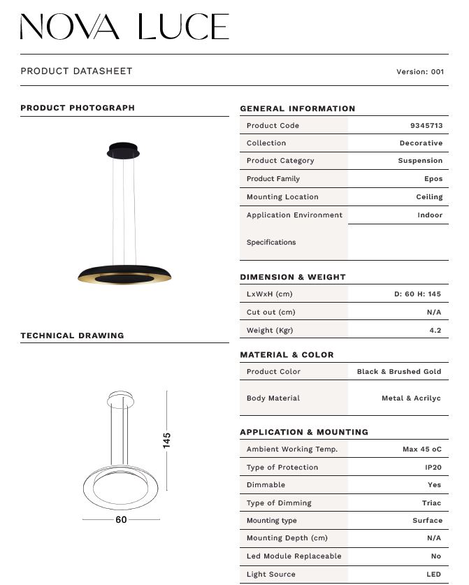 NOVA LUCE EPOS SUSPENSIE SP60 - Triac Dimmable Sandy Black & Brushed Gold Aluminium, Metal & Polycarbonate