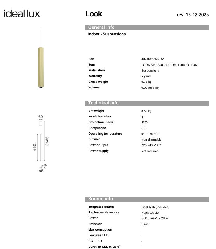 IDEAL LUX LOOK SP1 SQUARE D40 H400