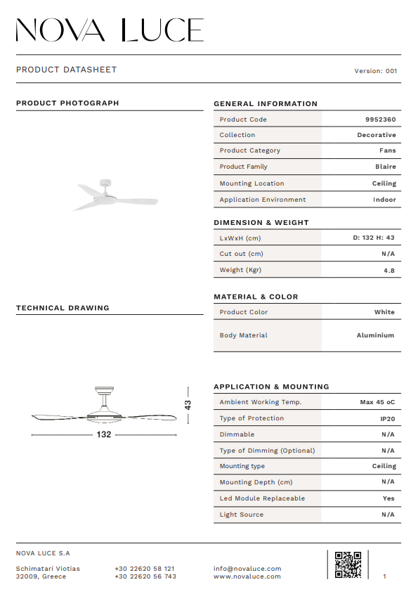 Material corp: Aluminium Matt White & Glass 3ABS White Blades