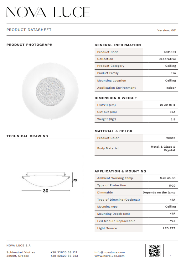 NOVA LUCE ERA plafoniera - 6311801 - White Glass & Crystal White Metal