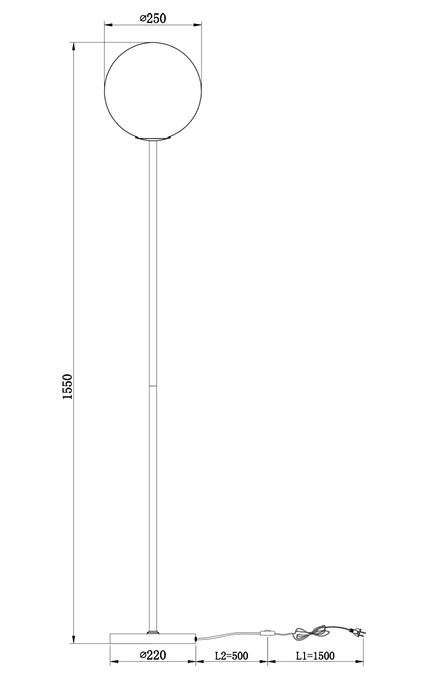 Dimensiuni: diametrul bazei 220 mm; diametrul abajurului 250 mm; inaltime 1550 mm;