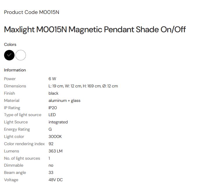 MAX LIGHT Maxlight M0015N Magnetic Pendant Shade On/Off 6W 363LM 3000K