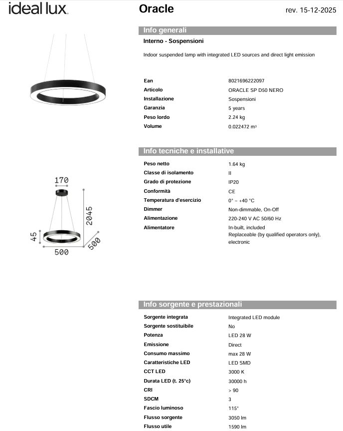 Dimensiuni: Ø 50 x H min 19,5 / max 120 cm LED 31W