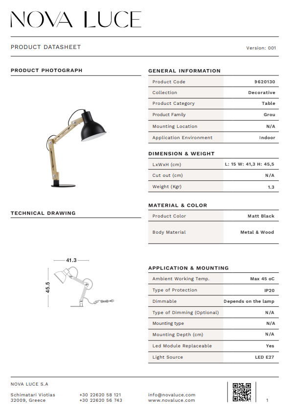 NOVA LUCE GROU veioza - 9620130 - Matt Black Metal & Wood